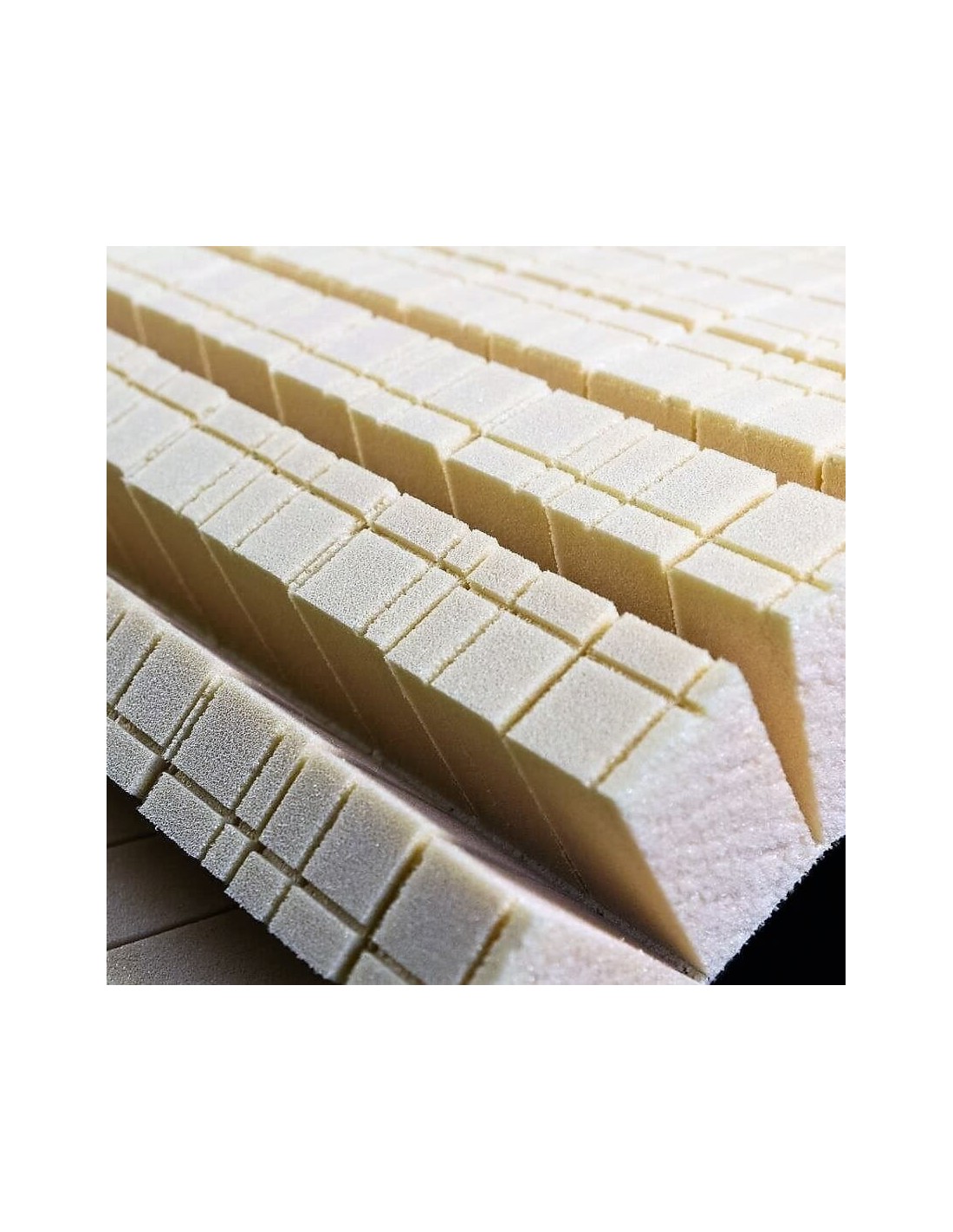 A prensa tem cortes em forma de U na direção longitudinal e transversal em toda a prancha. Para reforçar a ferro uma malha de fibra de vidro de baixo peso vai colada no lado oposto ao corte (à volta de ferro). Isso mantém unidos os quadradinhos de espuma, sem possibilidade de que se libertam.